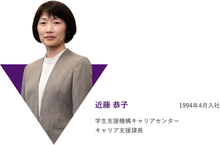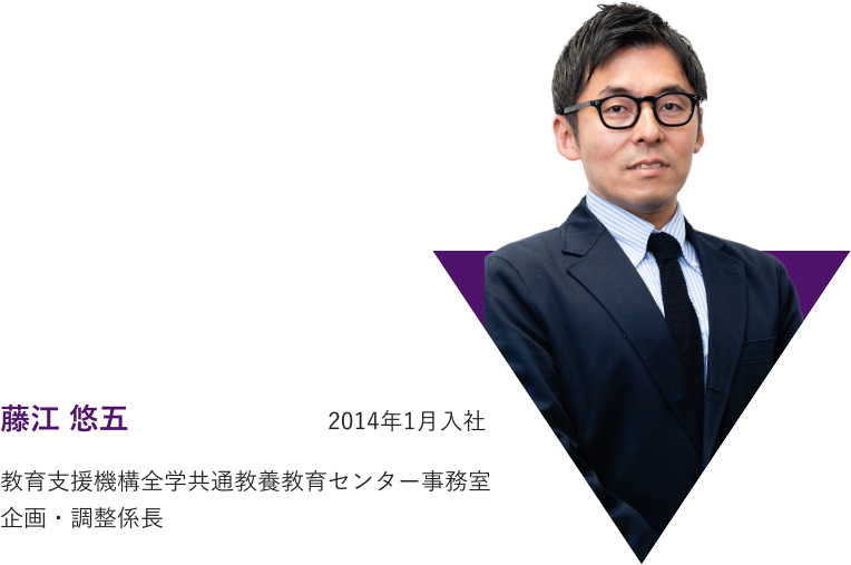 みなさんそれぞれの経緯があったのですね。私も藤江さんと同じく転職して大学職員になりました。前職では鉄鋼会社で営業や売り上げの管理を担当していました。こうした経験を通じ、管理や事務の立場から組織全体を支える仕事が自分に向いていると感じるようになり、大学職員を志しました。