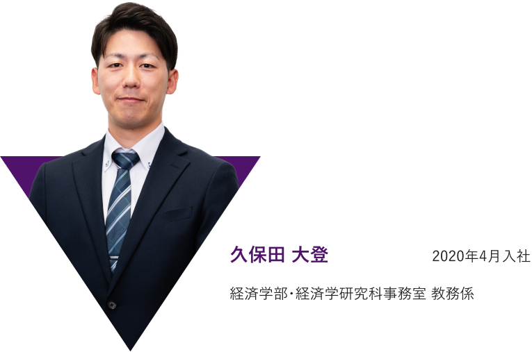 入職前に持っていたイメージとのギャップは、想像以上に大きかったです。学生時代、大学で働く職員の姿を見ていると「窓口で黙々と作業をしている」印象が強かったのですが、実際は全く違いました。最初に配属された施設部門では学外のさまざまな業者の方と関わり、現在の学部事務室では教員・学生・保護者と日々接しています。これほど多様な人と関わる仕事だとは入職前は想像できませんでしたね。